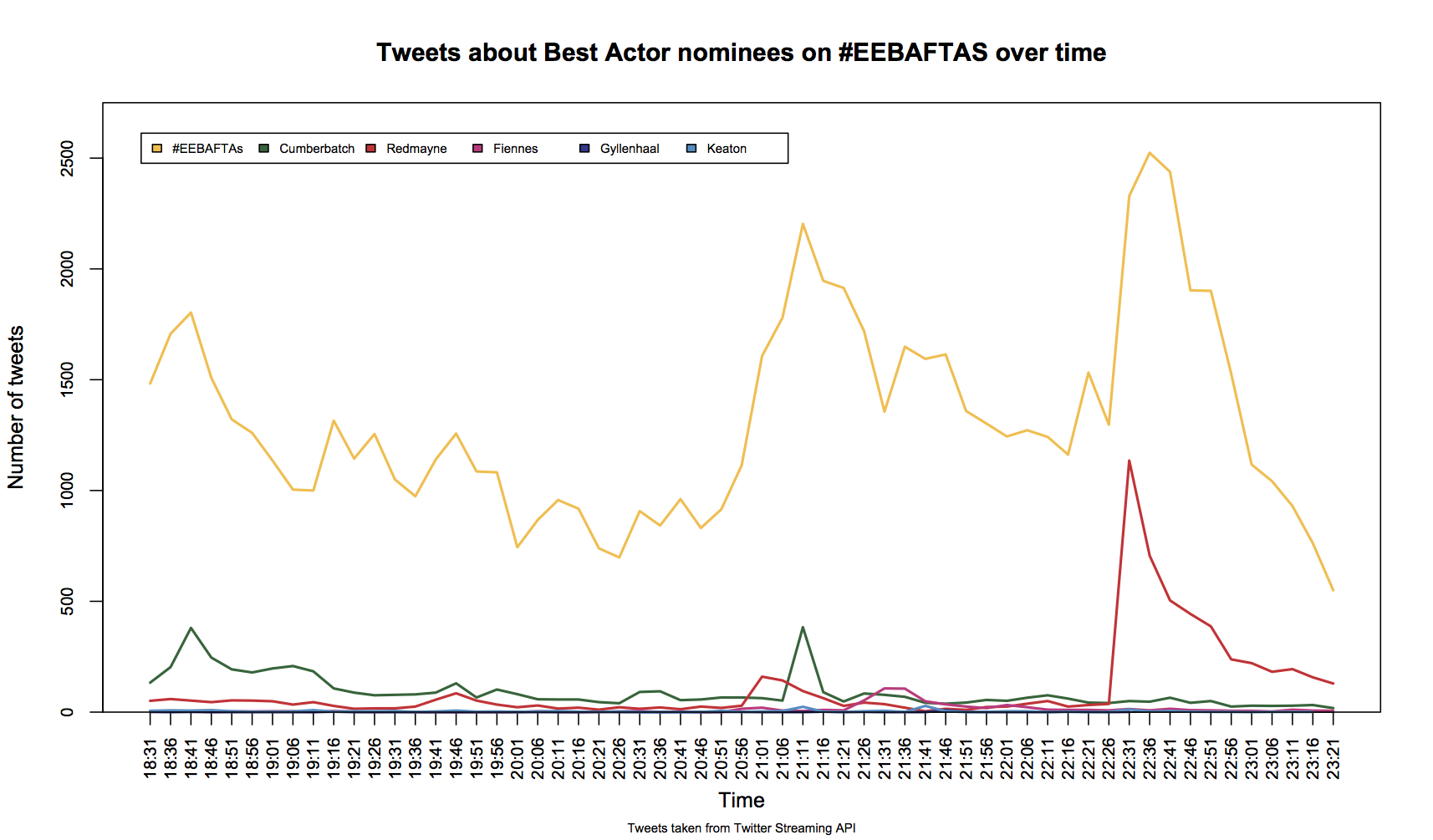 Looking at the time series data, it’s easy to spot the time that Redmayne picked up his award for Best Actor. Around half of all tweets captured at 22:31 mentioned Eddie Redmayne).