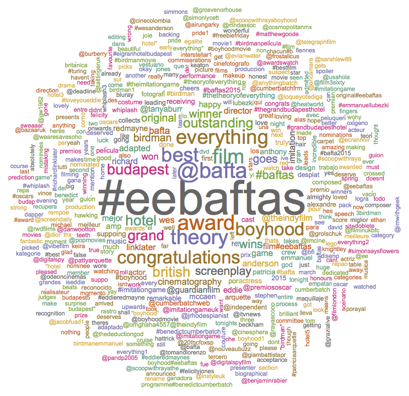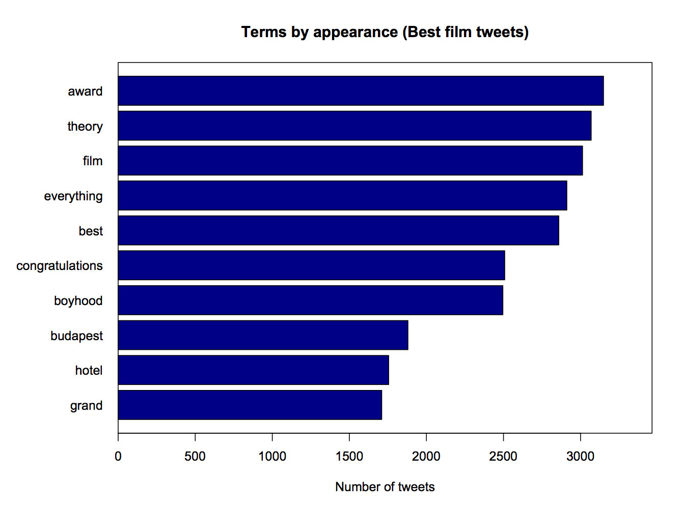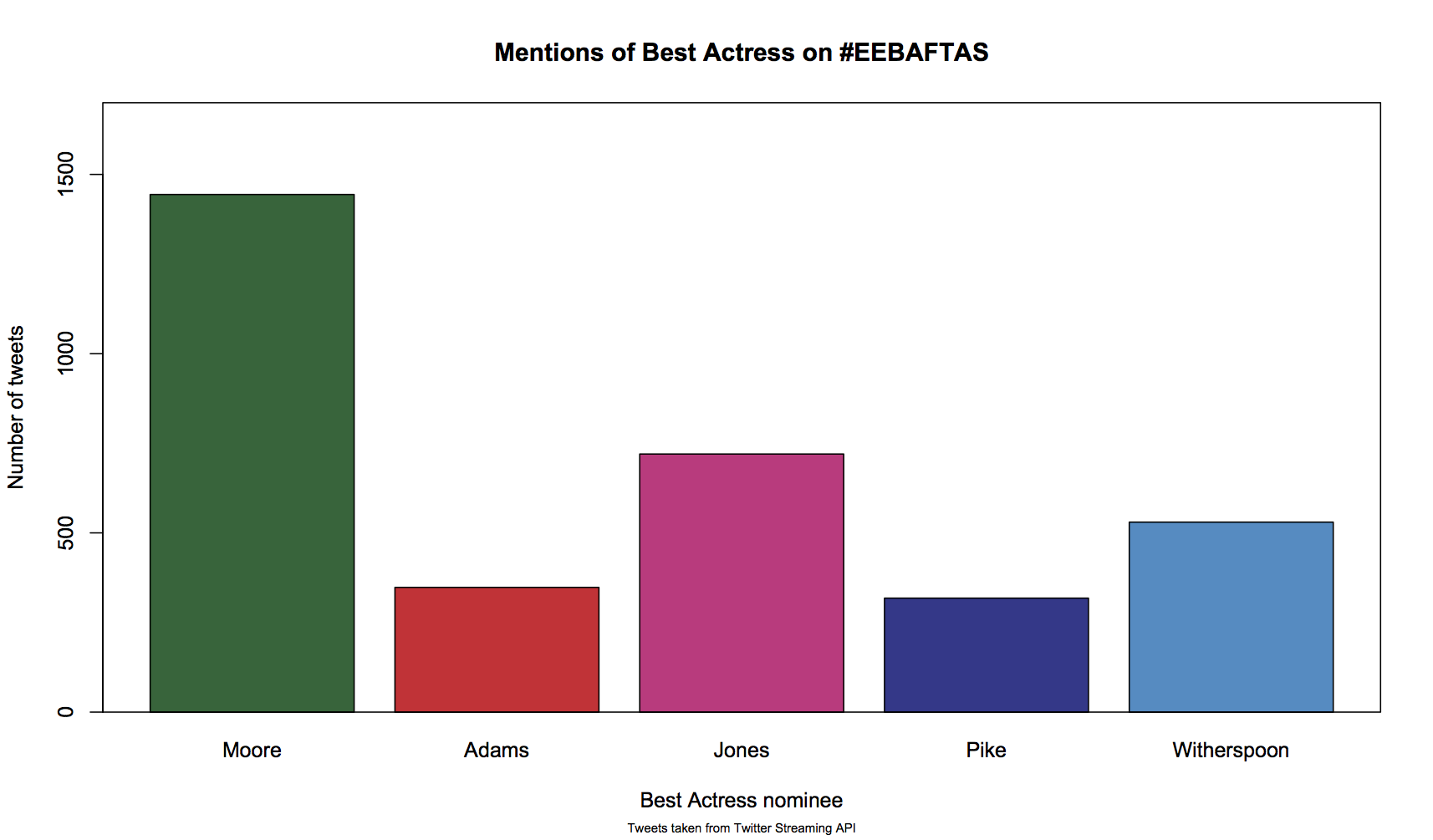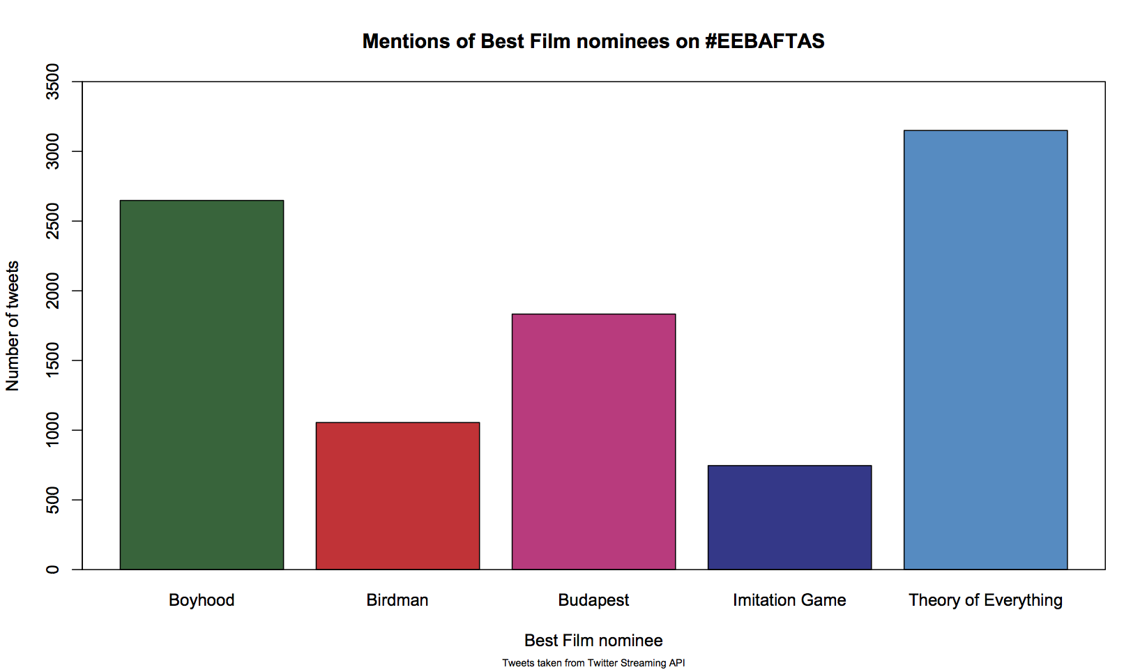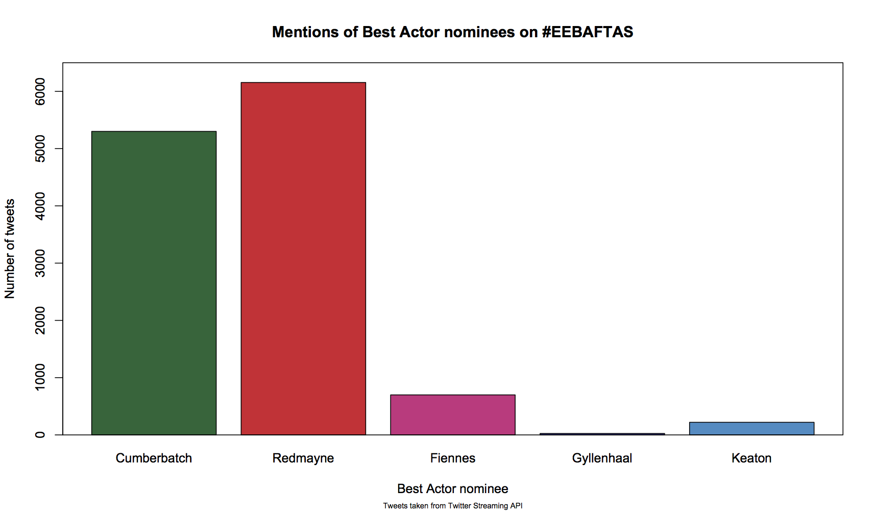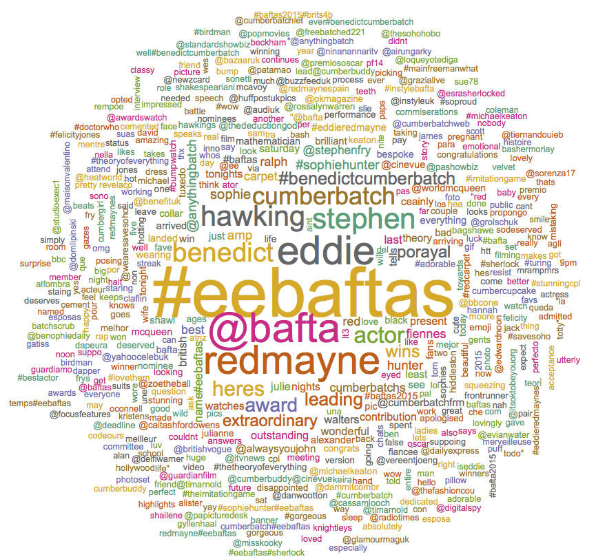 If Twitter is a barometer of the popularity of silver screen stars, then it seems Eddie Redmayne was the darling of the evening; and he, of course, bagged the prize for Best Actor. Perhaps most surprising is the disparity between tweets mentioning Redmayne and Cumberbatch, and the rest of the field. Equally surprising perhaps, is that Benedict Cumberbatch – and indeed the Imitation Game, for which he was nominated – didn’t walk away with any awards.