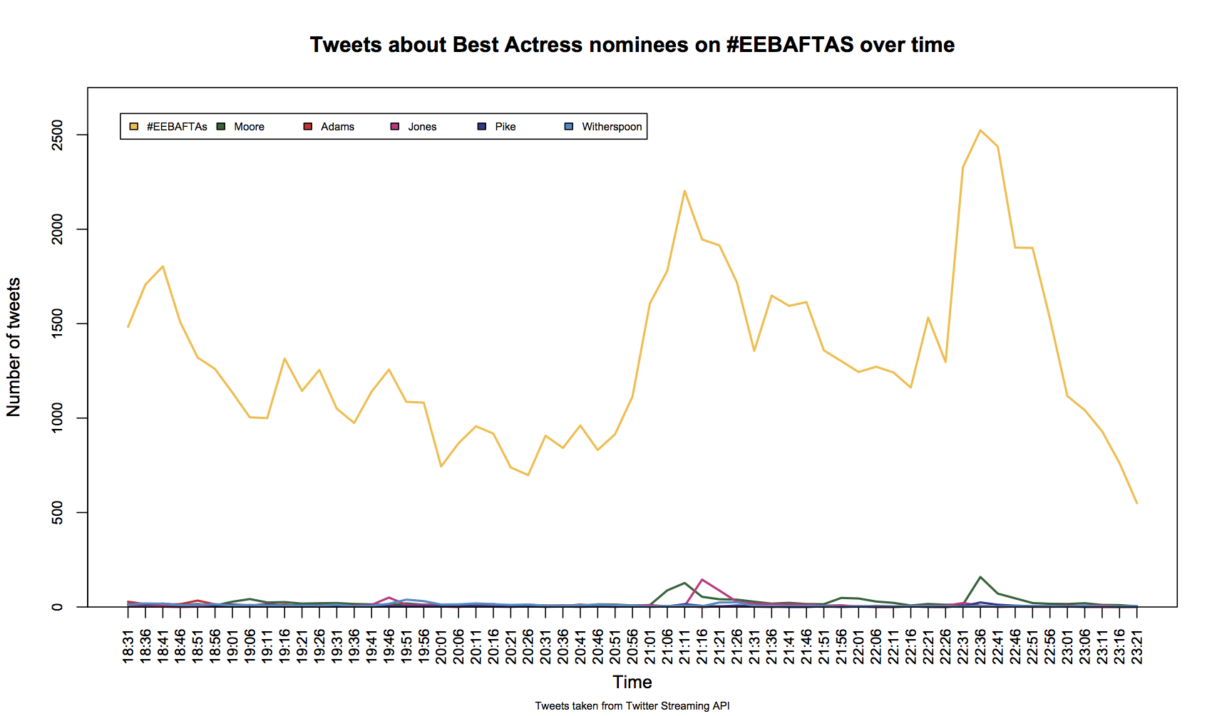 I used a Python script to link into Twitter’s streaming API, and download tweets with the #EEBAFTAs hashtag to a local .csv file. I left the connection to Twitter’s API open for around 6 hours, from 18:30 to 23:20. The televised broadcast of the BAFTAs happened between 21:00 and 23:00, but the event itself was a few hours before the broadcast.