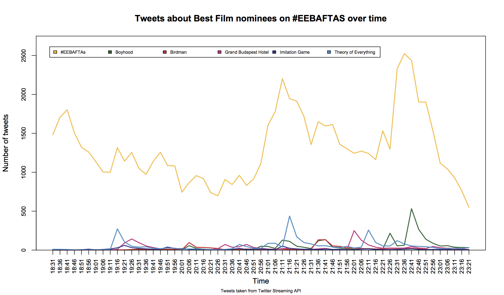 Of course, films are generally referenced across many categories at the BAFTAs, with the exception of the Imitation Game, each of the Best Film nominees walked away with at least one award. That likely explains the spikes as we look across the time series data.