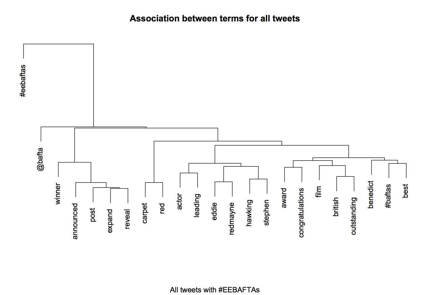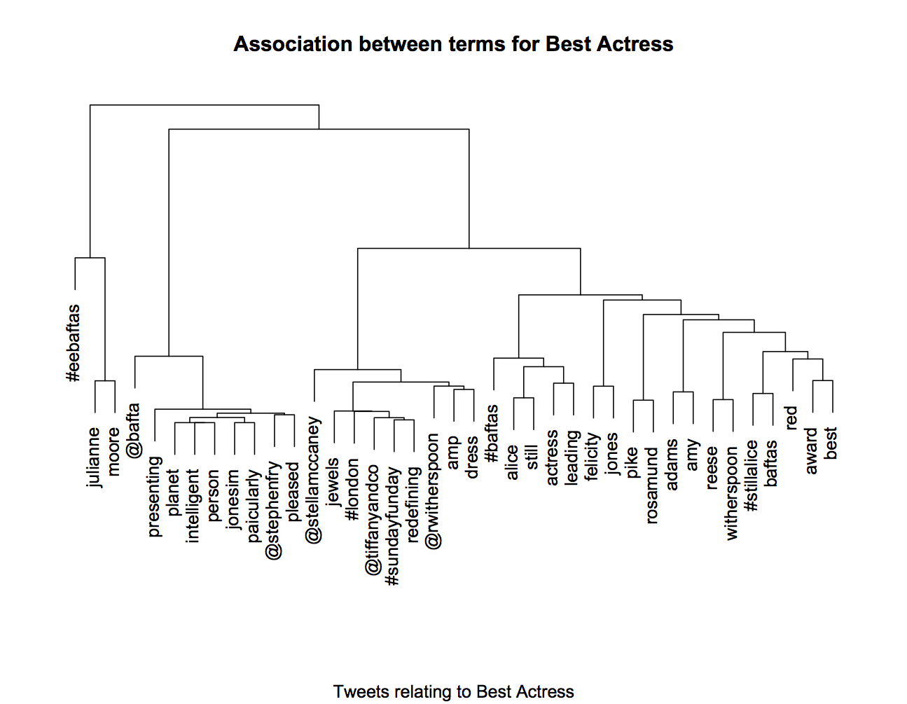 Perhaps most interestingly in this corpus, Julianne Moore’s film – Still Alice – is not closely associated in the clustering. Both the individual terms still and alice, and the hashtag #stillalice feature to the far right of the dendrogram, and after many branches.