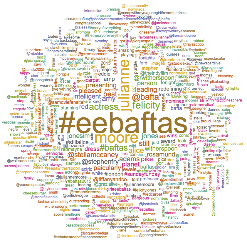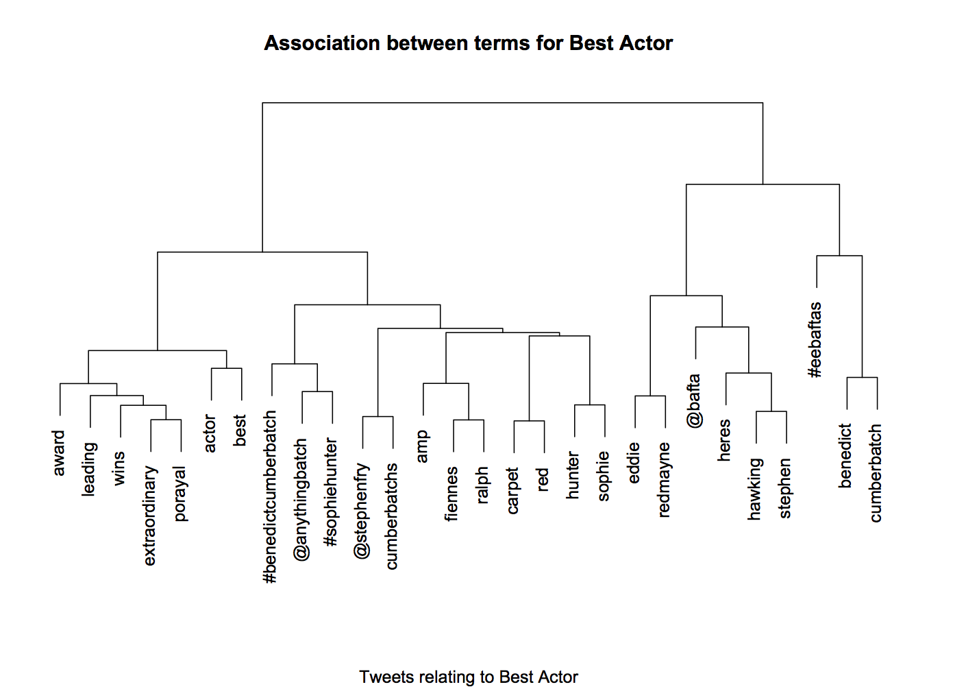 The Best Actress corpus is more similar to the main corpus, in that #EEBAFTAs is quickly shown as a dominant term in the clustering, as is the winner of the category – Julianne Moore.