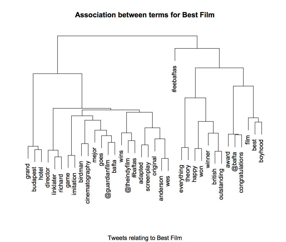 The Best Film corpus calls out #EEBAFTAs as a key cluster early on, and is most related to The Theory of Everything (terms: theory, everything) and Boyhood. Birdman, The Imitation Game and The Grand Budapest Hotel are distinct from these two films.
