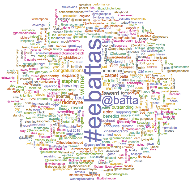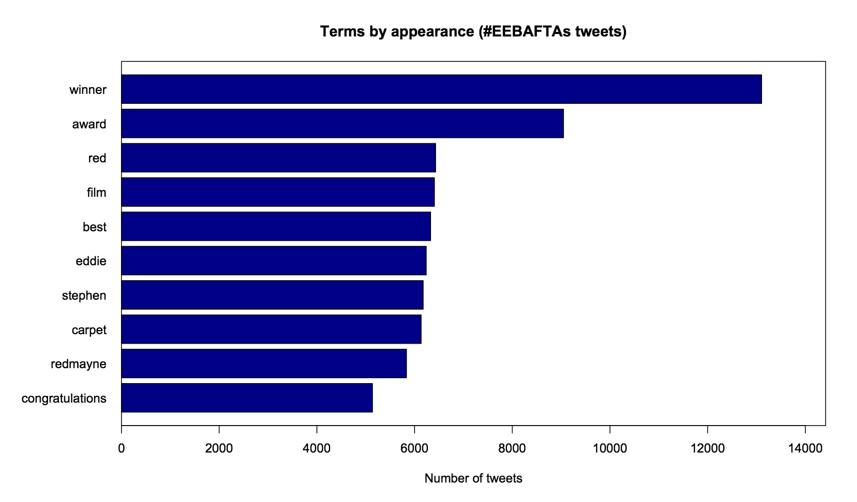 As has now become the cultural norm for events such as these, the awards were being tweeted by the masses. Many of these tweets accompanied by the event’s official hashtag – #EEBAFTAs. And as is now becoming a geeky norm for me, I decided I wanted to do some quick and dirty analysis of those tweets.