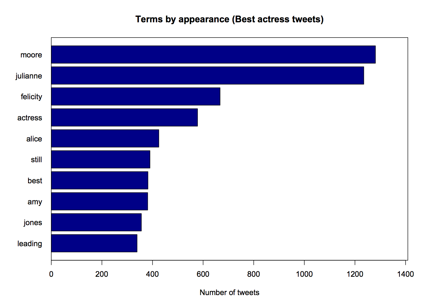 It seems the Best Actor nominees stole the show entirely too. Of all the tweets mentioning Best Actress nominees, Julianne Moore comes out on top – unsurprisingly, given that she won the Best Actress category. However, Moore didn’t get even a quarter of the mentions of Eddie Redmayne did.